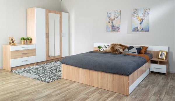 Спальня Алена выполнена в стиле минимализм - естественные цвета, текстура дерева, простота и функциональность. В комплекте Алена оптимальный набор функциональных модулей, который необходим для обустройства спальни: вместительный шкаф с полками и штангой, комод с ящиками, кровать с крепким и надежным основанием из ламинированной плиты и прикроватные тумбы. Кровать с двух сторон идеально дополняют идентичные по стилю прикроватные тумбы с высокой стенкой на одном уровне с изголовьем кровати - это создает визуальную целостность, добавляет ощущение защищенности.