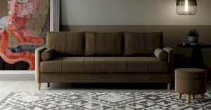 Комплект состоит из прямого и углового диванов, кресла для отдыха и пуфа.