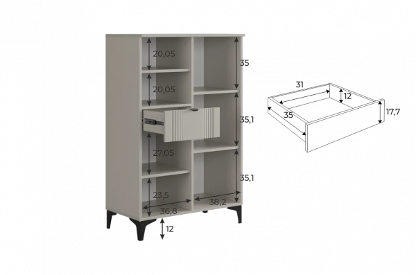 Дизайн комода продуман до мелочей: с одной стороны расположена глухая дверца, за которой скрывается просторное пространство для хранения. С другой стороны – ниша с открытой полкой, выкатной ящик и ещё одна глухая дверца, что позволяет гибко организовать хранение и поддерживать порядок в доме.
