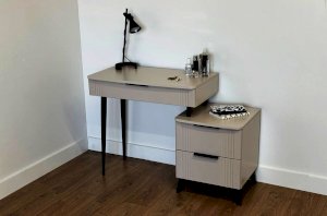 Благодаря своему дизайну трюмо «Катрин» легко впишется в любой интерьер и гармонично сочетается с другими модулями спальни «Катрин». Выкатные ящики предоставляют достаточно места для хранения различных предметов, а возможность использования трюмо в качестве письменного стола делает его универсальным элементом мебели.
